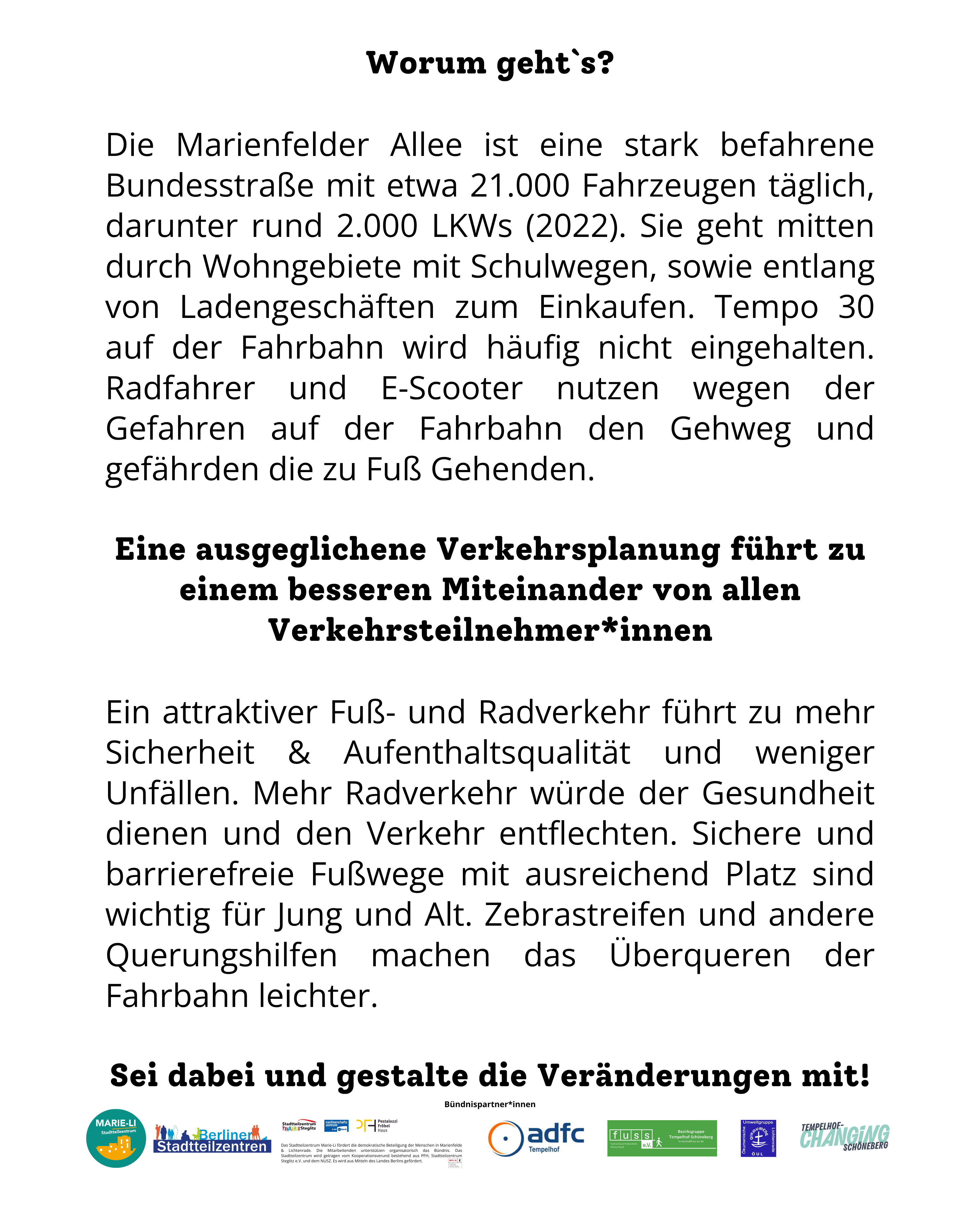 Auf der Marienfelder Allee erleben wir das täglich mit mehr als 20.000 Fahrzeugen, davon 2.000 LkW. Die angeordnete Geschwindigkeit von 30 km/h wird oftmals mißachtet. Ein hoher Lärmpegel und schlechte Luftqualität sind Marker einer autogrechten statt einer menschengerechten Stadt. Wir fordern eine gerechte Aufteilung des Straßenraums zur Schaffung von mehr Lebensqualität, mehr Gesundheit, mehr Wohlbefinden.