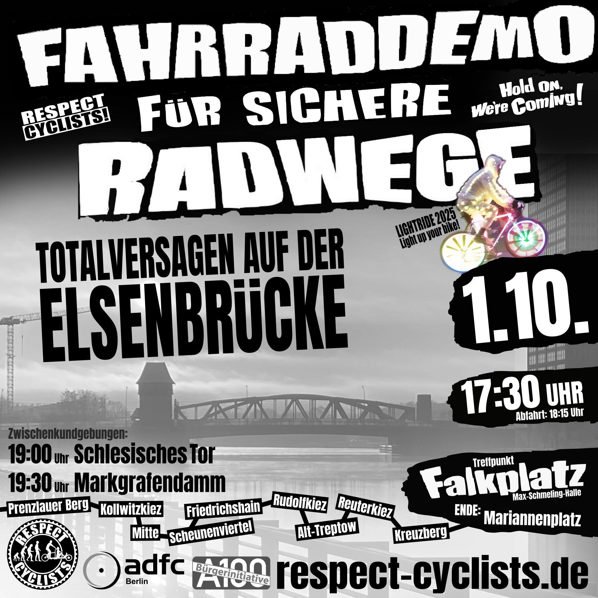Wir rufen zur Fahrraddemo auf: Mittwoch, 1.10.2025 - Demo für sichere Radwege auf der Elsenbrücke