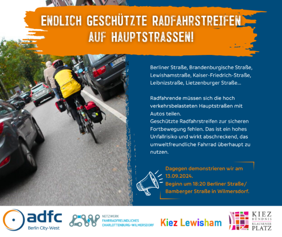 Am Freitagnachmittag, 13. September 2024, demonstriert die ADFC Stadtteilgruppe City West zusammen mit mehreren Kiezvereinen mit einer Fahrraddemo für sichere Radwege auch an den Hauptstraßen in unserem Bezirk.