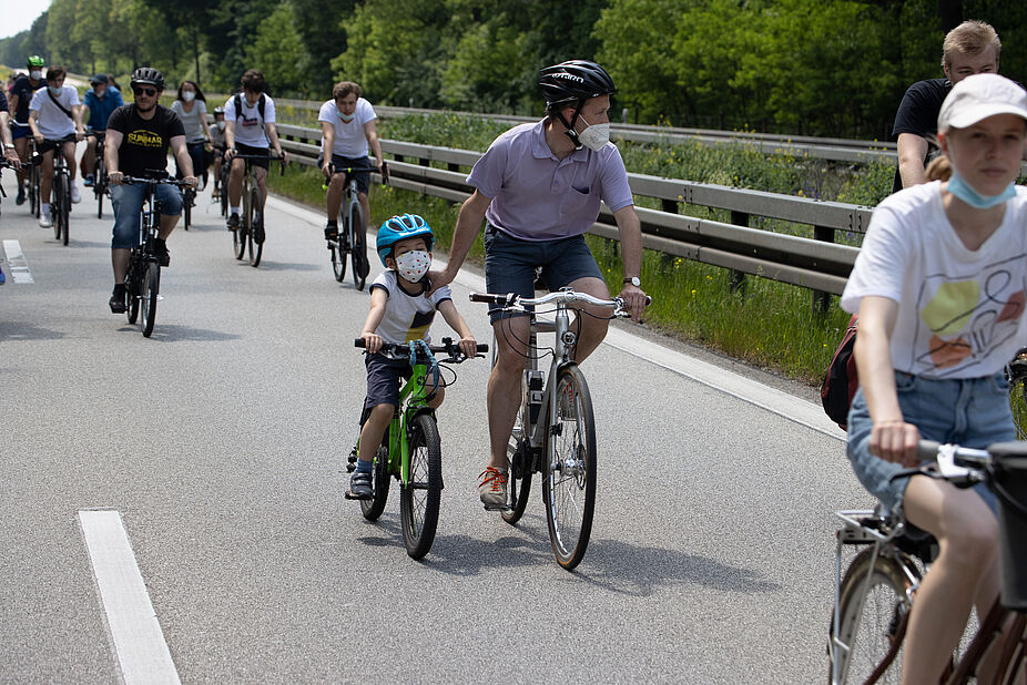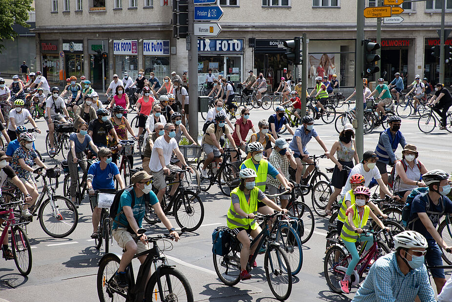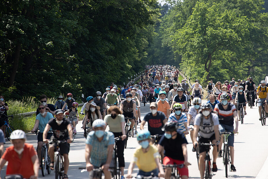 Die Fahrraddemonstration findet unter Einhaltung der Corona-Schutzregeln statt. Es wird auf Abstand geachtet, die Teilnehmenden tragen Maske.